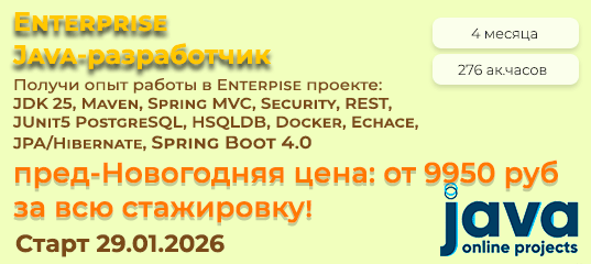 - Начиная с 4-го занятия, участники разрабатывают собственный выпускной проект на стеке Maven/ Spring MVC, Security/ Hibernate/ REST, ревью которого входит в участие с проверкой.