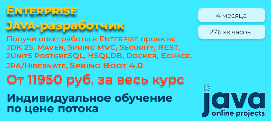 - Начиная с 4-го занятия, участники разрабатывают собственный выпускной проект на стеке Maven/ Spring MVC, Security/ Hibernate/ REST, ревью которого входит в участие с проверкой.